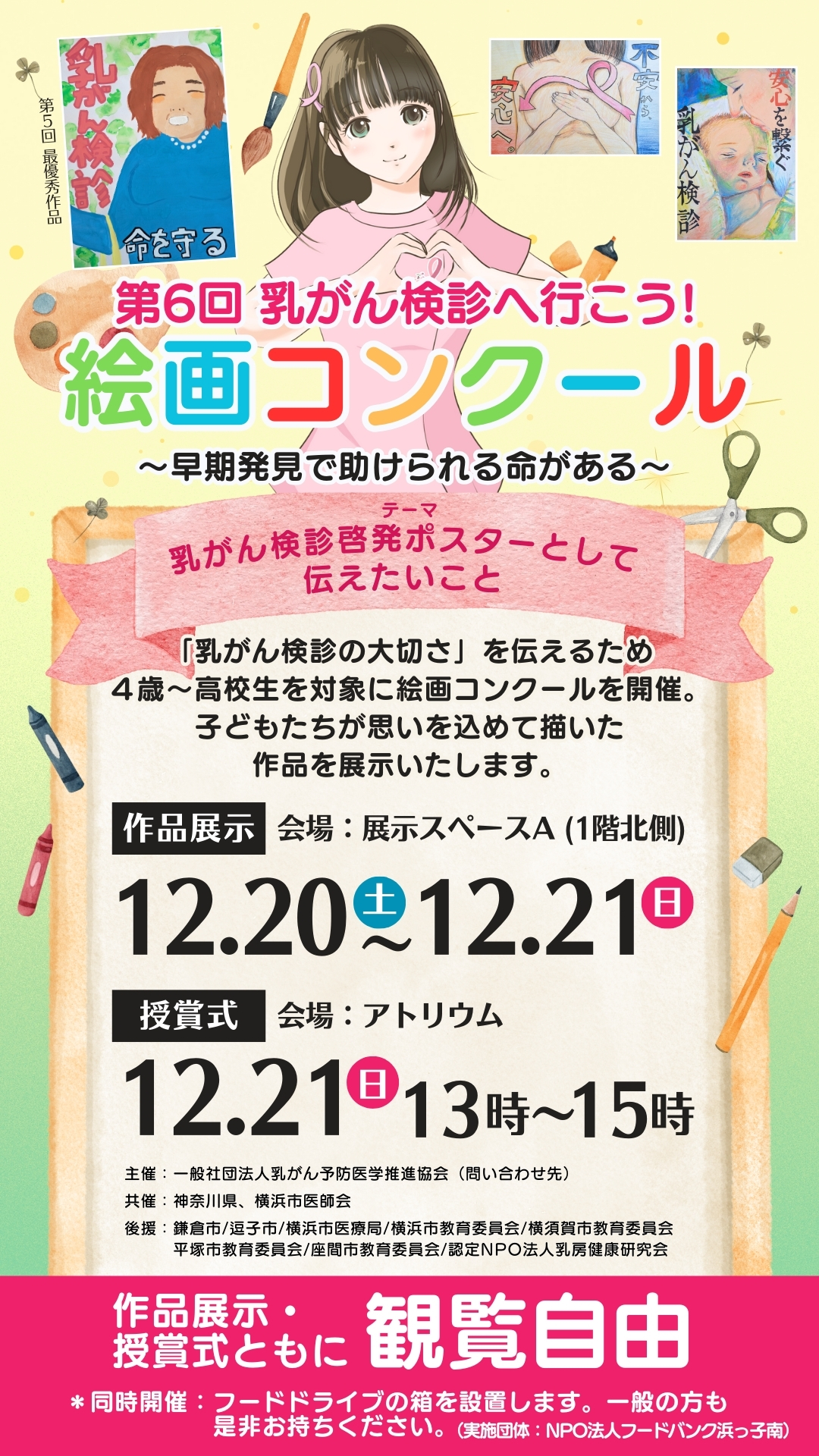 このコンクールは、未来を担う子どもたちが「乳がん検診」について考え、表現することで、家族や地域に予防の輪を広げるきっかけとなることを願って企画されました。展示会においては関係者以外の方もご覧いただけます。皆さまのご来場を心よりお待ちしております。