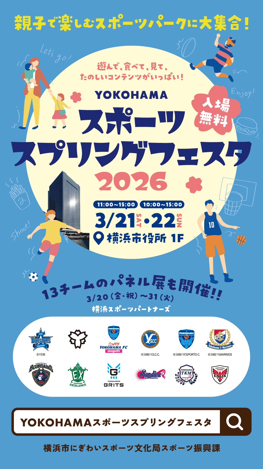 3月21日(土曜日)、22日(日曜日)に横浜市役所で「YOKOHAMAスポーツスプリングフェスタ2026」を開催します。横浜市を本拠地とするトップスポーツチーム(横浜スポーツパートナーズ)の体験ブースや、スポーツクラブ メガロス、フィットネスクラブ ティップネス、スポーツクラブNASの子育て世代向けプログラム、一般社団法人横浜市総合型地域スポーツクラブ協議会の体験ブースが楽しめます。また、予約不要の託児サービスやスタジアム・アリーナグルメを楽しめるキッチンカーもご用意。ご家族そろって春のスポーツ体験をお楽しみください!