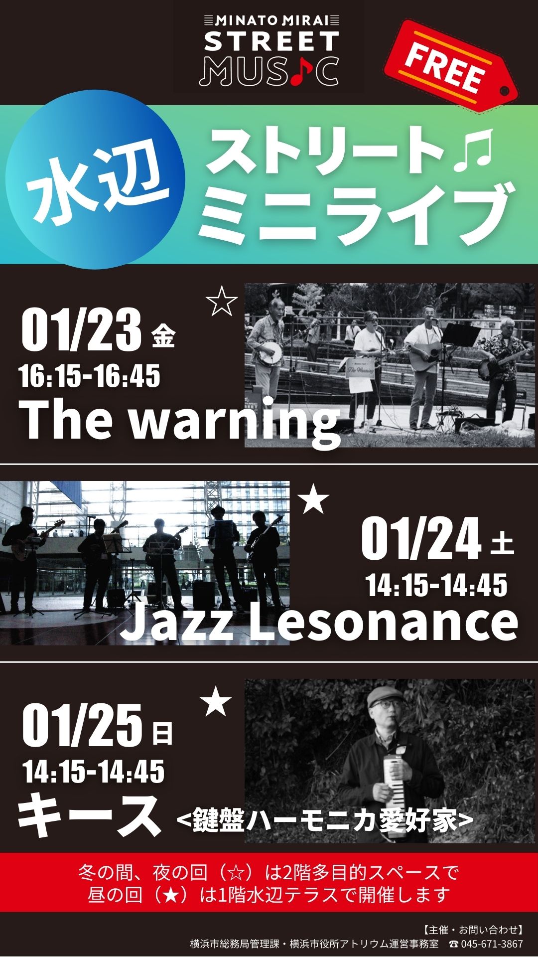1/23(金)-25(日)、横浜市役所にて【水辺ストリート♬ミニライブ in 横浜市役所】を開催します。みなとみらいの景色を一望できるロケーションで生ライブをお楽しみください。(※冬季夜間は屋内で開催いたします。)